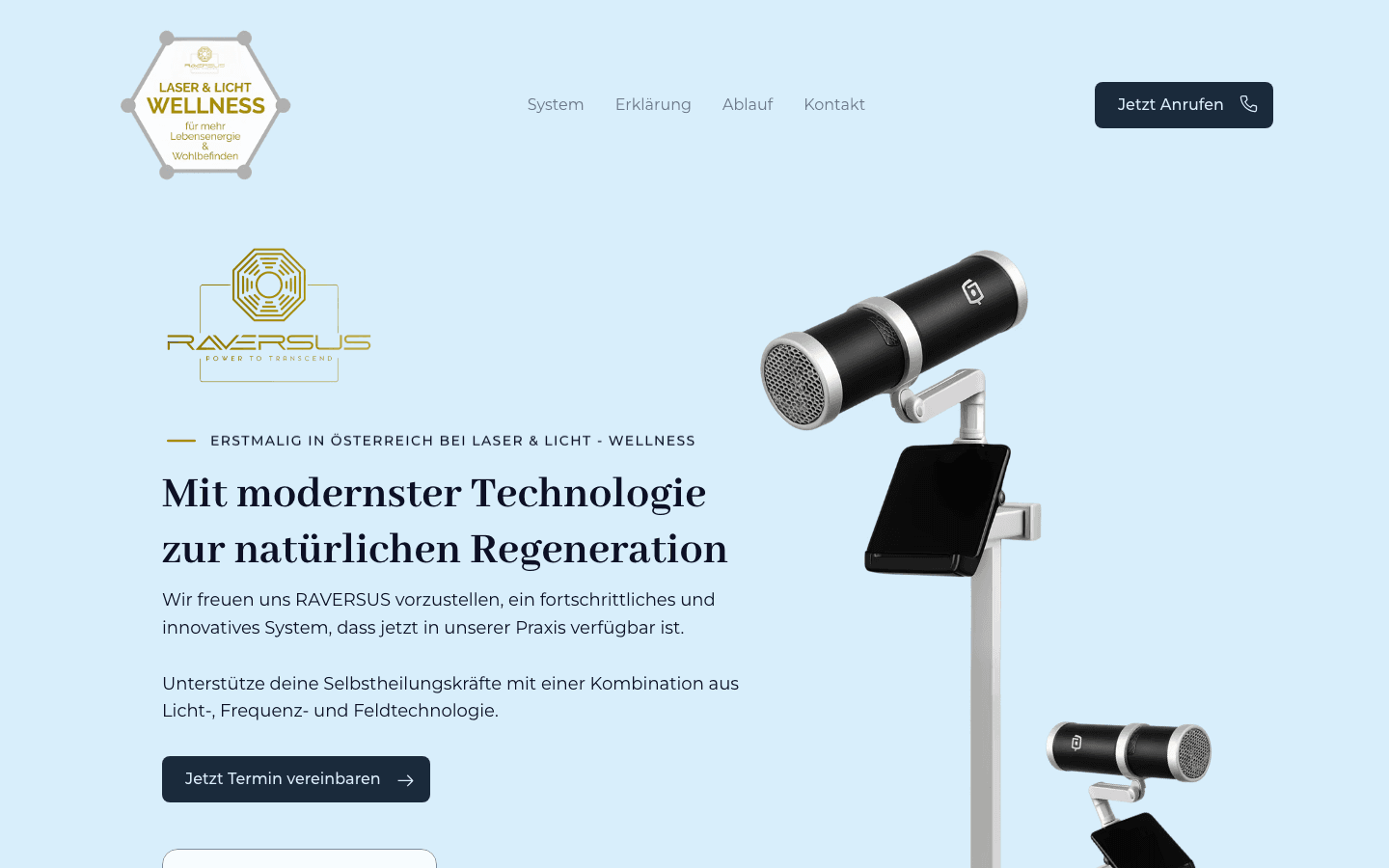 Modern light and frequency therapy for natural regeneration. First RAVERSUS system in Austria, and we made the site feel just as cutting-edge as the tech.